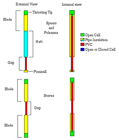 | Spear | 48" | 74" | 8 | 8 | 15 | 24 | 24 | 50 | 4 | The soft foam tip of the spear should be larger in diameter than the pipe insulation to keep it from falling over when used. The Thrusting Tip and Blade should be silver duct tape. Another color duct tape (brown) or a ring should be used to differentiate the waft from the blade. |