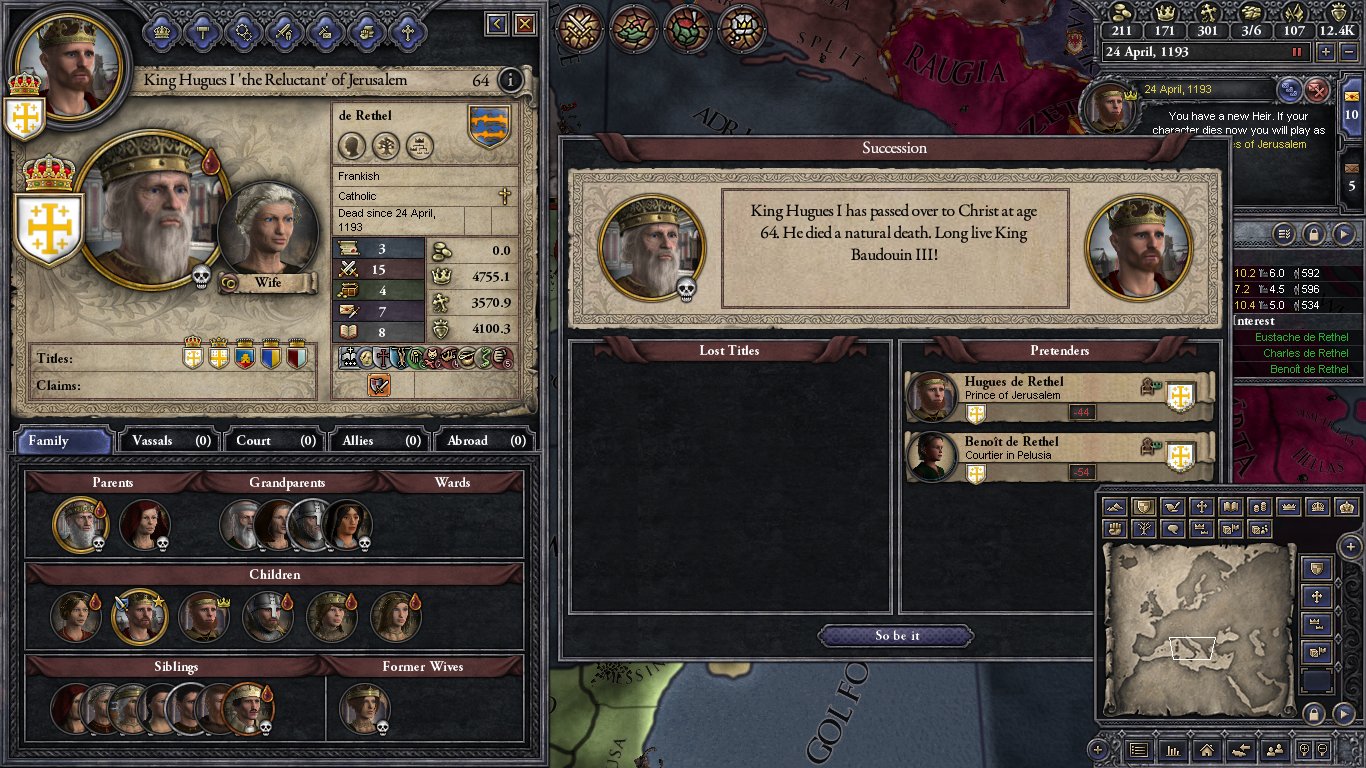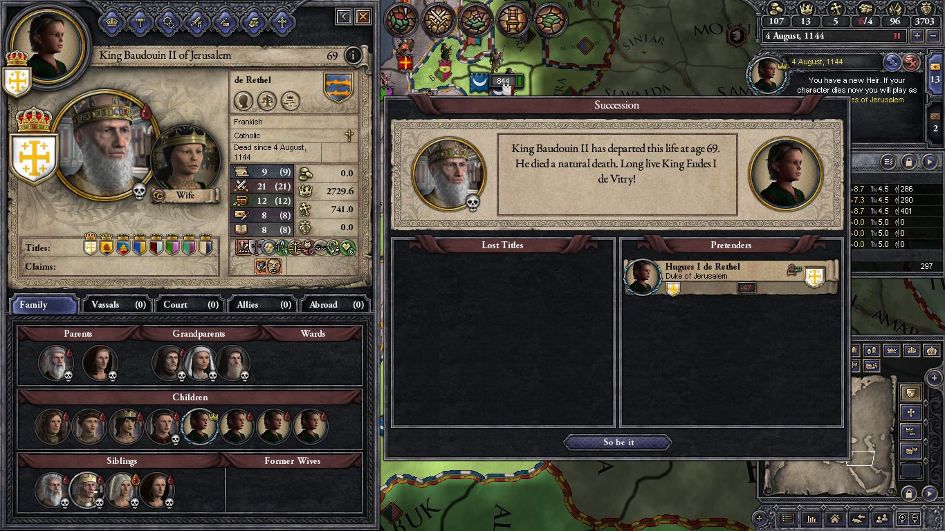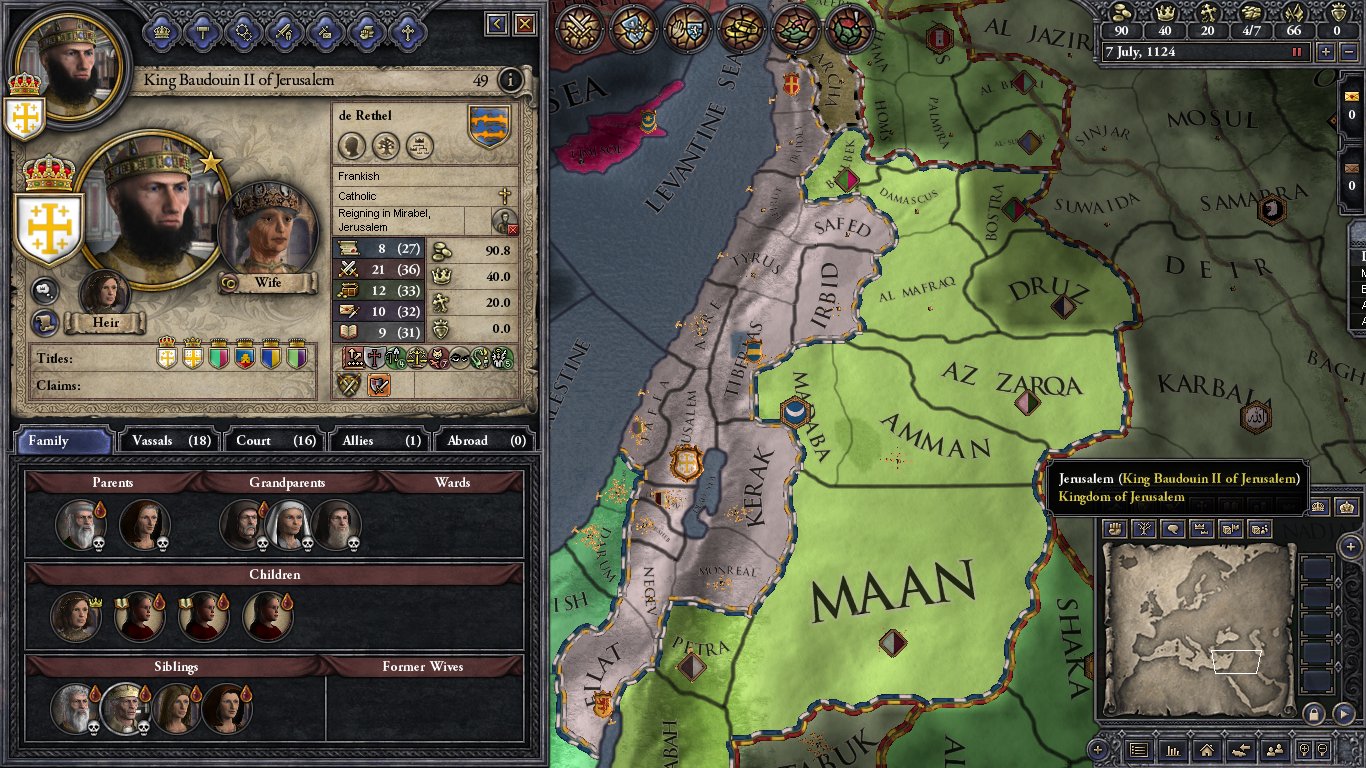 In 1124 Baudouin is 49 years old. He has 4 daughters; Melisende (19), Alice (14), Hodierne (13) and Yvette (5). His wife Morfia is too old to provides another child. In real life he was devoted to her and refused to put her aside and replace her. He also has 2 sisters, only one of who is married, and a nephew Ithier who is part of the dynasty by his sister Matilda. Both of his brothers are dead and his only ally is the Duke of Armenia Minor. The counties he controls are not centrally located. He is surrounded by Muslims; Fatimid Shite Egypt to the West, and Sunni's to the East. The laws of the kingdom are Agnatic-Cognatic Gavelkind so the younger daughters will break up the realm when Baudouin dies and the next king will most likely be Melisende's husband.