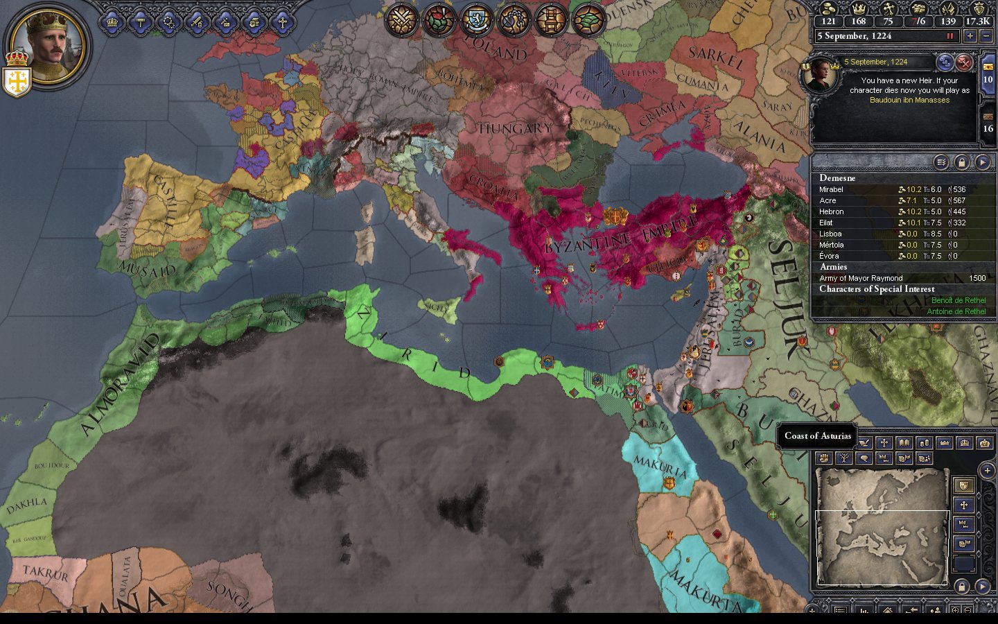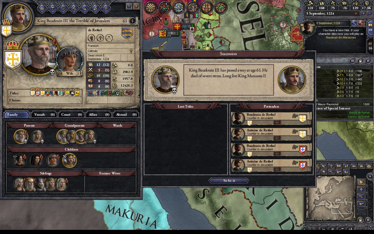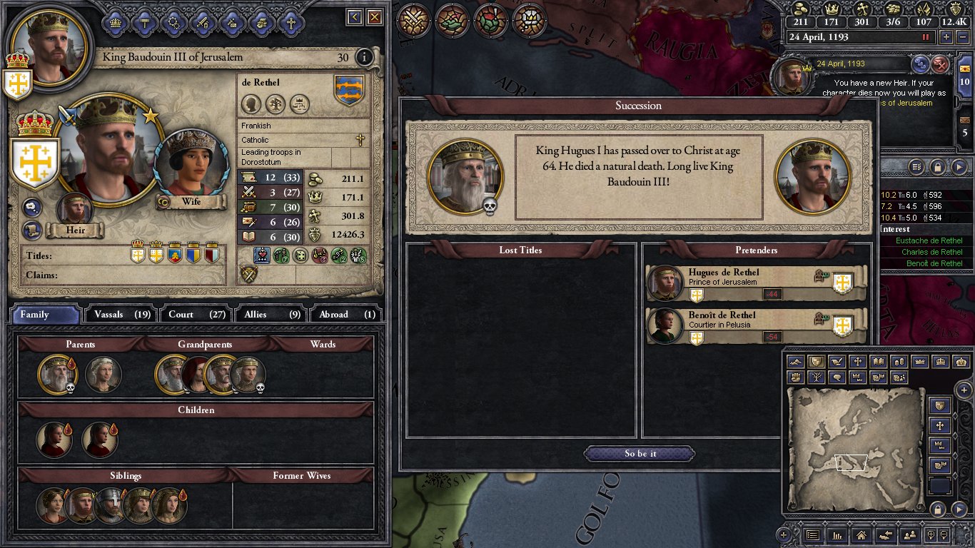 In 1124 Baudouin is 49 years old. He has 4 daughters; Melisende (19), Alice (14), Hodierne (13) and Yvette (5). His wife Morfia is too old to provides another child. In real life he was devoted to her and refused to put her aside and replace her. He also has 2 sisters, only one of who is married, and a nephew Ithier who is part of the dynasty by his sister Matilda. Both of his brothers are dead and his only ally is the Duke of Armenia Minor. The counties he controls are not centrally located. He is surrounded by Muslims; Fatimid Shite Egypt to the West, and Sunni's to the East. The laws of the kingdom are Agnatic-Cognatic Gavelkind so the younger daughters will break up the realm when Baudouin dies and the next king will most likely be Melisende's husband.