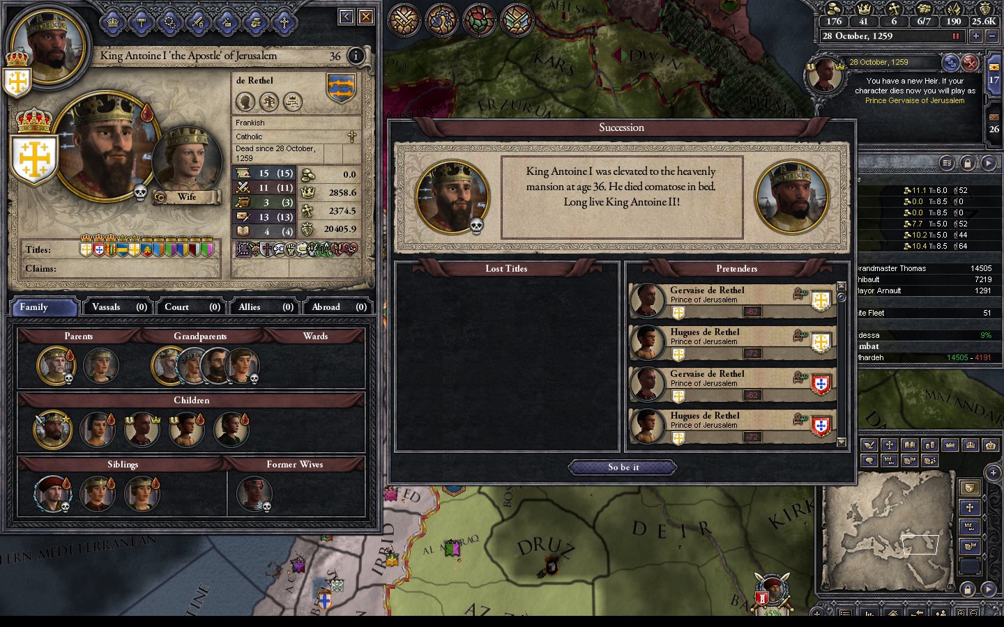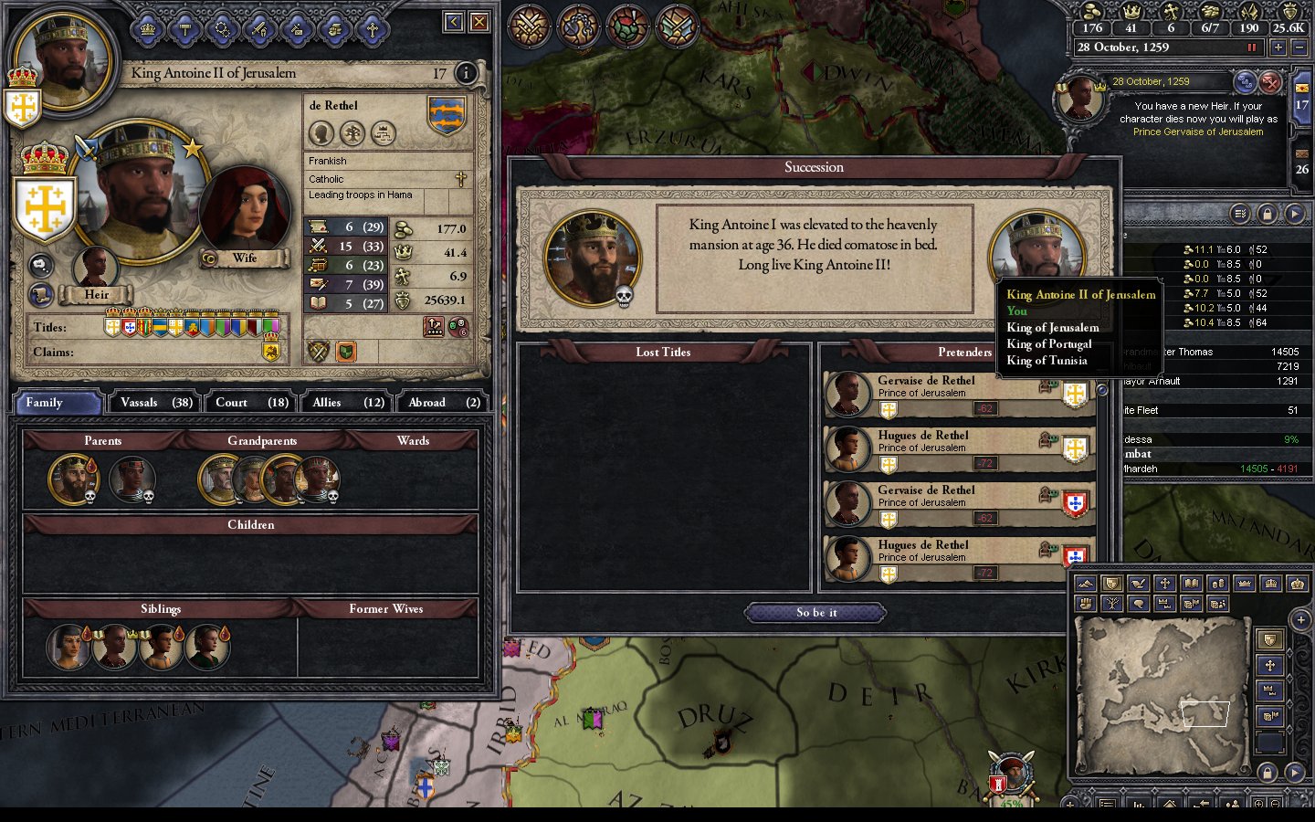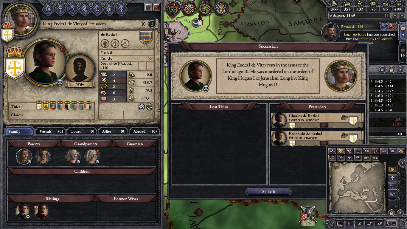 - 1145.6.1 The battle in Antioch is lost. Prince Hughes (who hates me) is appointed spymaster.