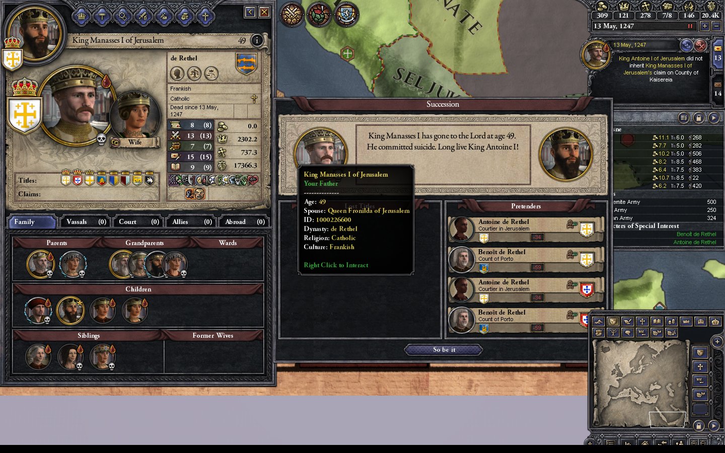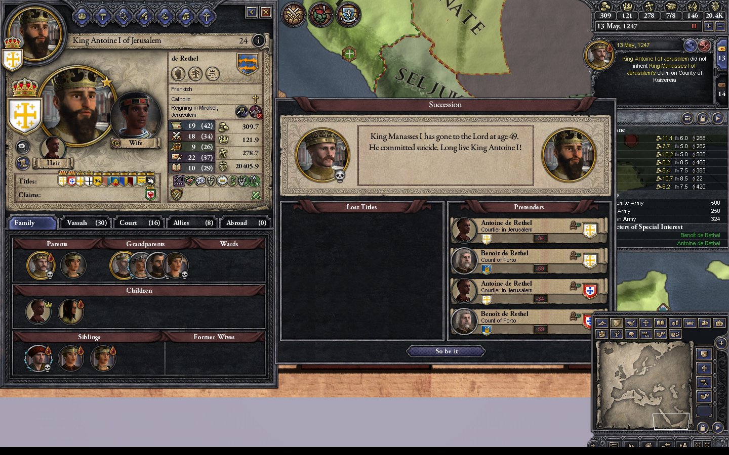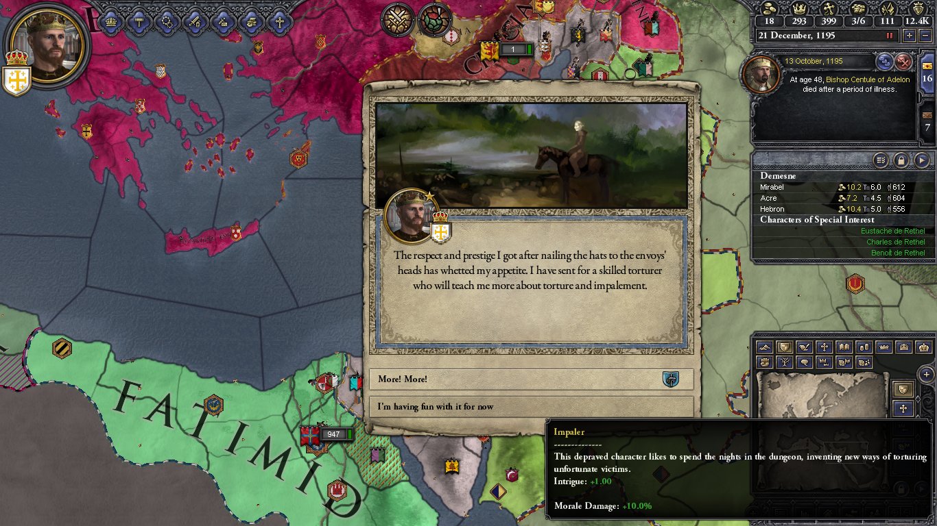 - 1145.6.1 The battle in Antioch is lost. Prince Hughes (who hates me) is appointed spymaster.