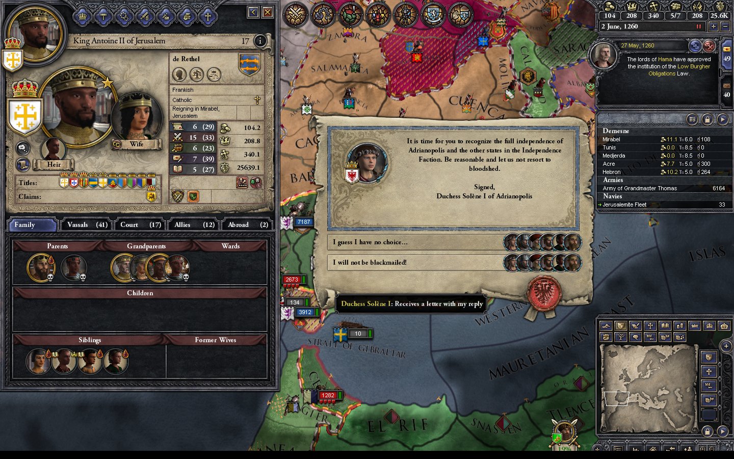 - 1125.7.24 After a successful visit by my chancellor I call Armenia Minor in to aid us against Egypt.