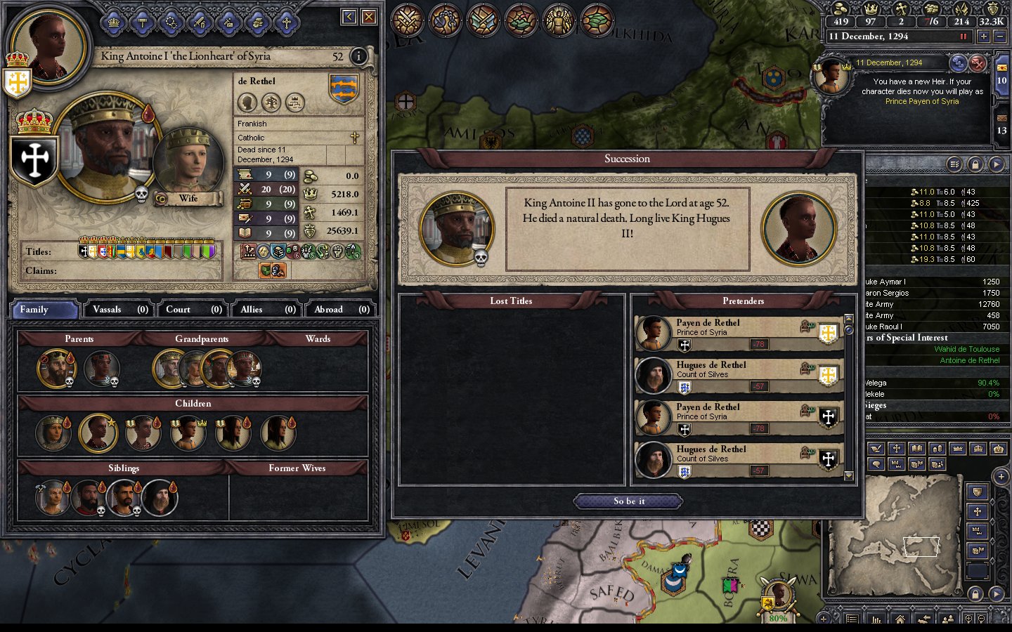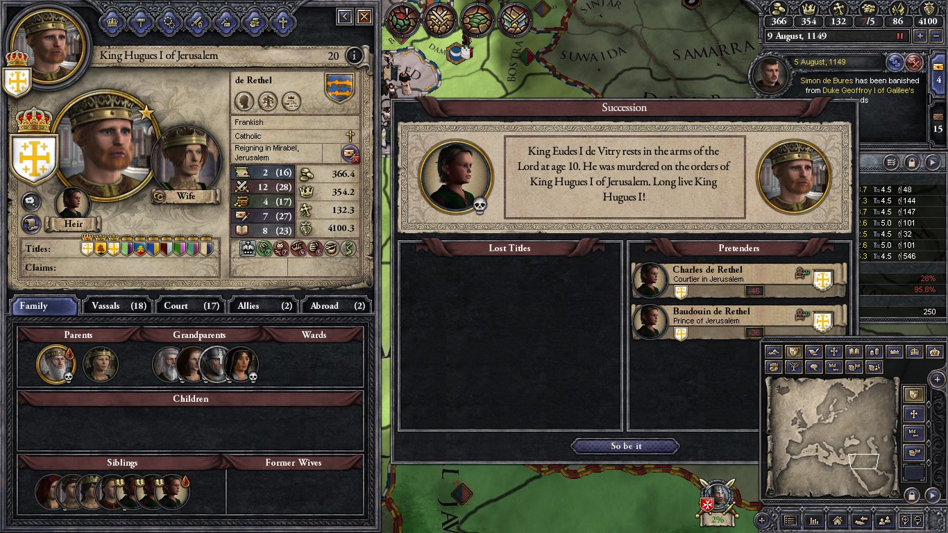 Hues II comes to the throne unprepared. He is lacking in intrigue. and slothful. His vassals dislike him, severely. He is embroiled in a long war for Abyssinia that seems to never have and end. He has a younger brother, and older sister who sister who sits as the Queen of Castile, and two younger sisters. His genius Uncle Hugues will be a problem, particularly since his genius 9 year old son will be around for most of Hugues II reign. The Pope dislikes young Hugues too.