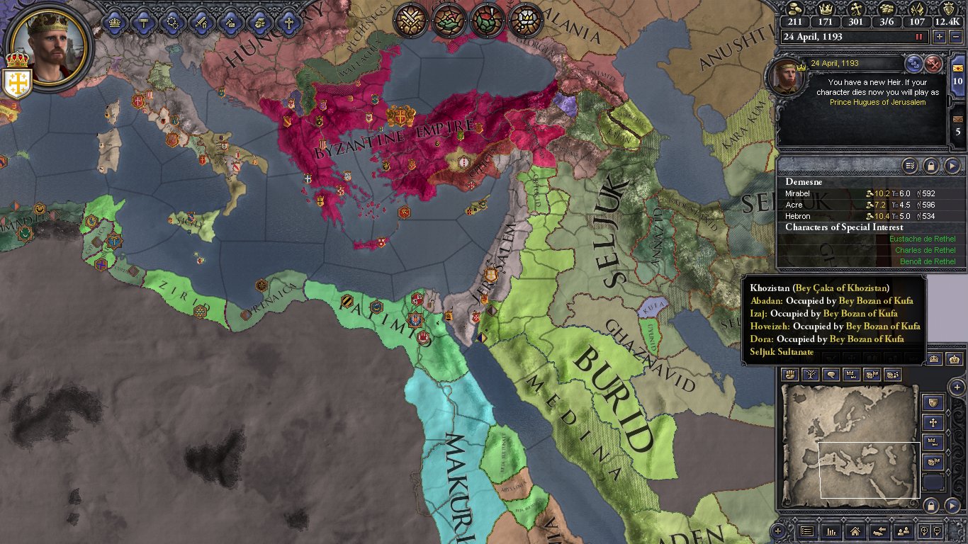 Hugues III added Abyssinia to the realm and arrange for the inheritance of France by his son when Queen Margarita dies. He lost Aleppo to the Ilkhanate but his skillful diplomacy severely dented their power when they raided Jerusalem.