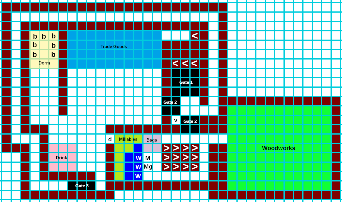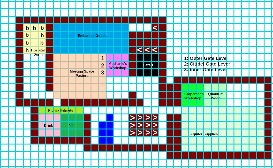 The Carpenter shop/aquifer supplies area can be converted into a Woodworks. The mechanics shop disassembled and moved downstairs. The hospital/dorm can be left as a dorm for new migrants but the hospital should be moved downstairs. A mill can be built off the waterwheels. The Embarked Goods stockpile can be converted to a Trade Goods stockpile. This is also a good time to convert the level into a 3 gate defensive area forcing the enemy through a long series of traps.