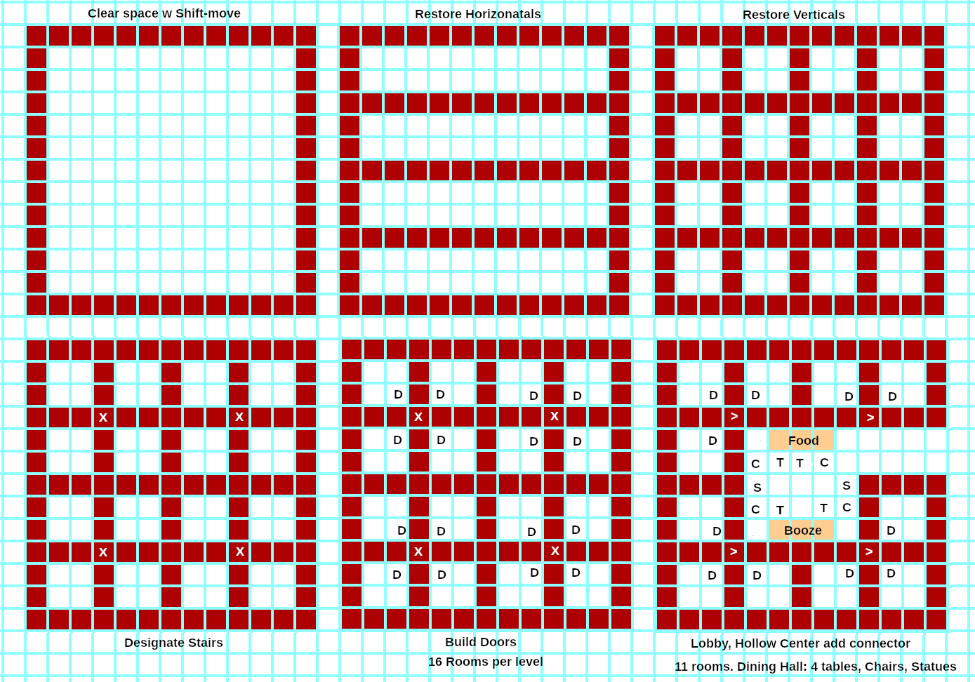 Add a second layer as soon as feasible. Hollow out the center 4 rooms and use as a dining hall.