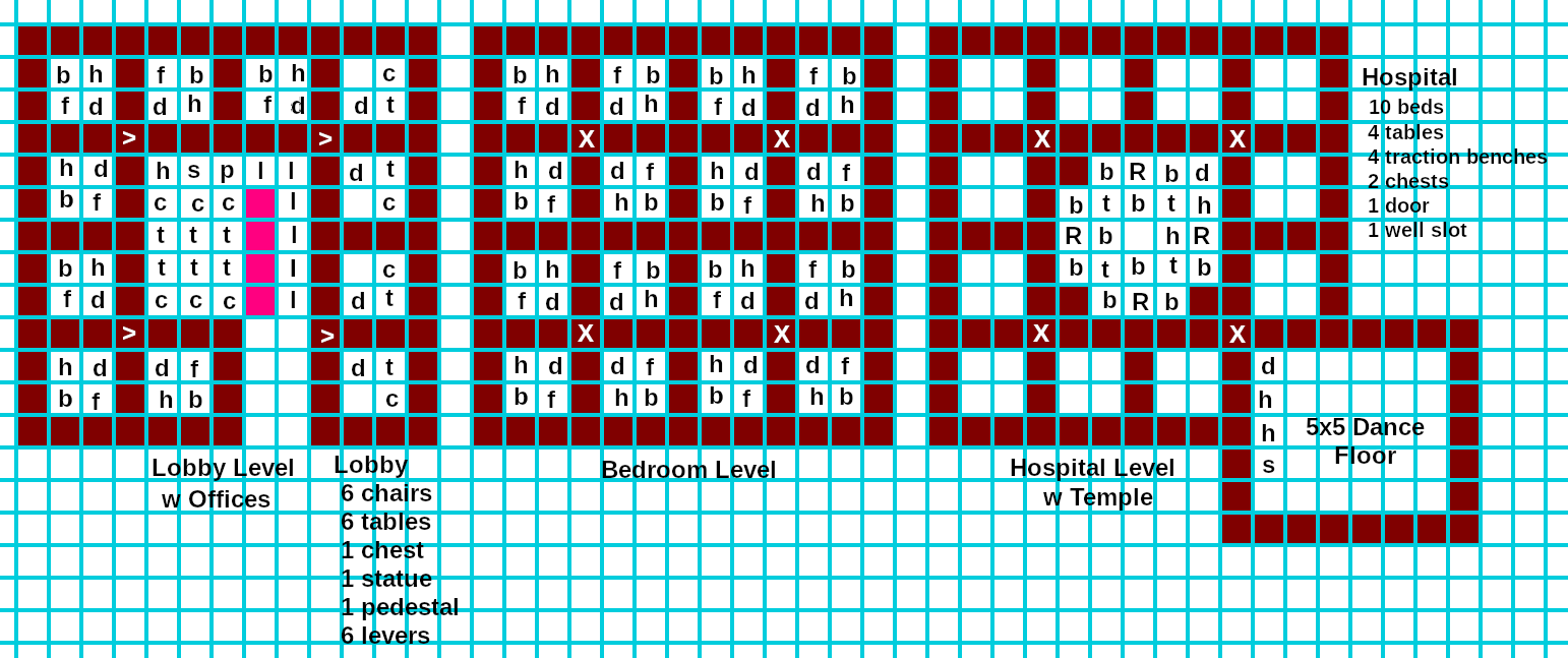 The first lobby level rooms are often reserved for offices and hospital. Place only 1 throne for an office, or a bed and a table for hospital rooms. Put the hospital storage containers in the lobby with traction benches. Reserve the