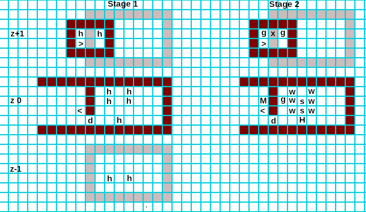 - In the waterwheel room channel out 5 squares as shown "h". Once dug channel out the two squares on the level below that aren't directly under the already channeled squares but next to them as shown. Do this quickly before the fill with water.