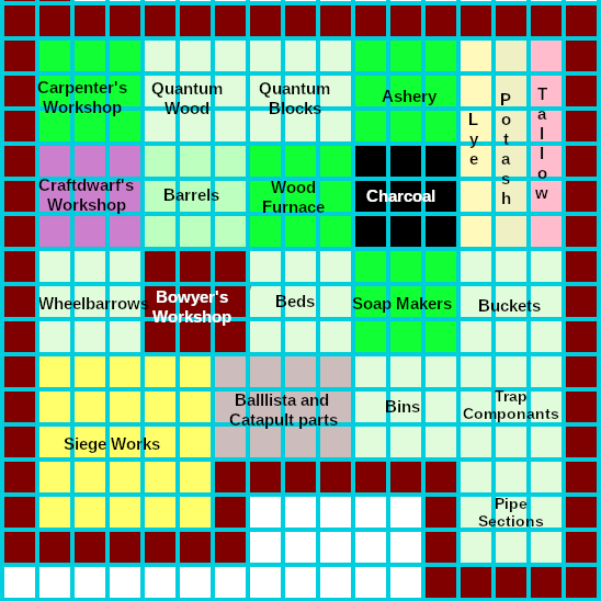 The woodworks should be near the source of lumber. Either close to the surface or the caverns. This is particularly important if charcoal is being made. The woodworks is at least partially in operation very quickly after embark and hence near the surface entrance.