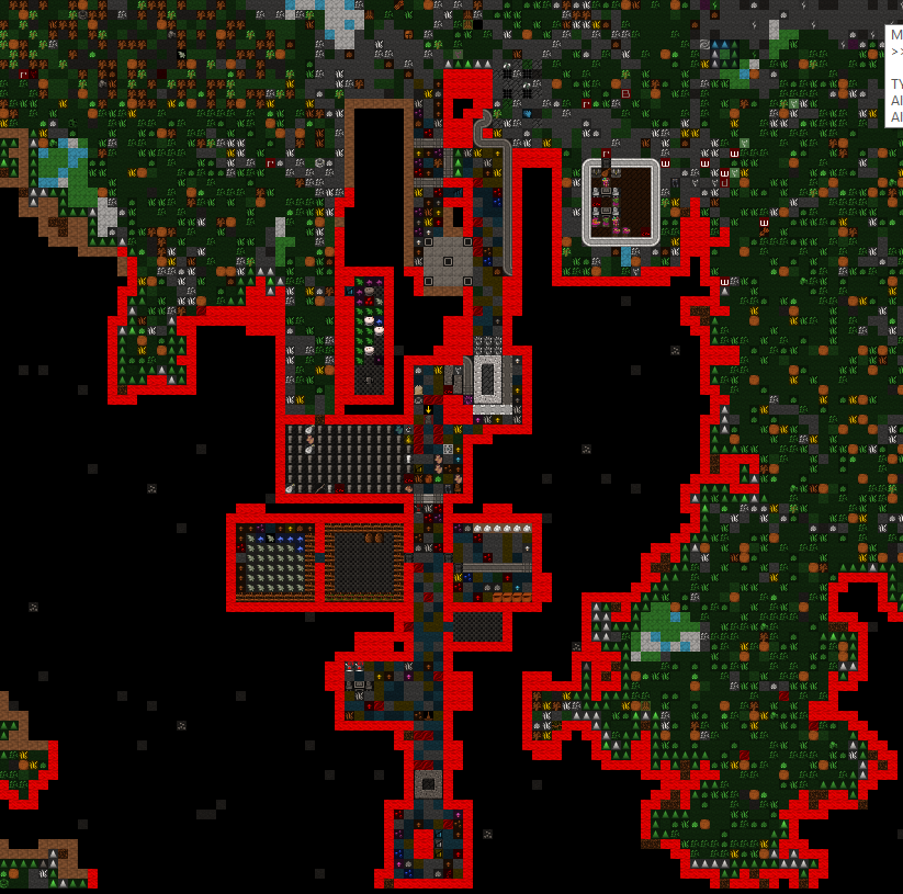 The fort sits on a single z-level high plateau amoungst the bayberry trees of the Adventrous Forest (taiga) on the world Kar Lathon. Of value on the taiga is blade weed and longland grass. Raccoons are frequent visitors and theives. Grizzley bears, wolverines, reindeer and musk oxen have also been observed. North of the fort is small permenantly frozen creek that has never been bridged.