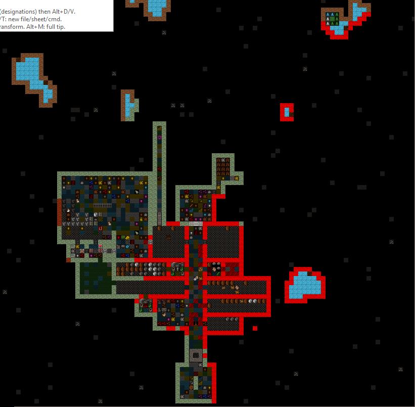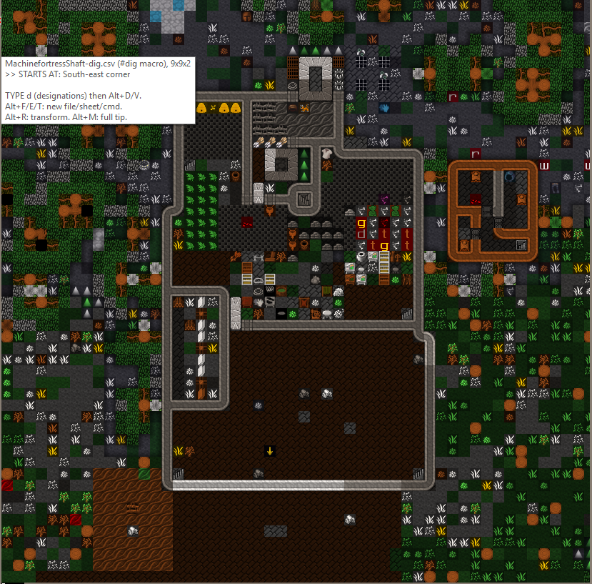 The initial dig was into the red sand plateau just west and below the current entrance. Later the entrance was relocated to the top of the plateau and enclosed in a two story stone citidelA fort was built around the entrance/citidel to enclose various outdoor workshops and stock piles. The back half of the fort was used for a pasture. In later years the pasture was walled off from the front of the fort, and eventually the animals wer relocated underground for saftey. The former animal pen is now unused. The interior of the fort is mostly oaved over with a wooden road. On the west side are three windmills powering the millstones directly beneath them. The forts walls are two story with fortifications on the second level and an interior walkway for marksdwarves. Four stairs lead from the ground level to the walkway.