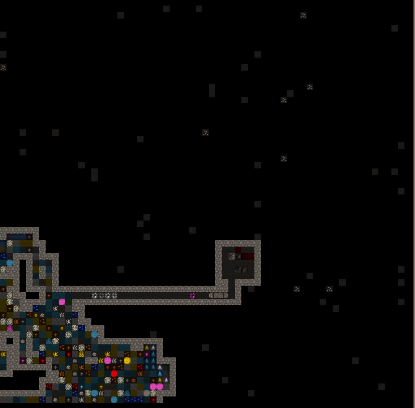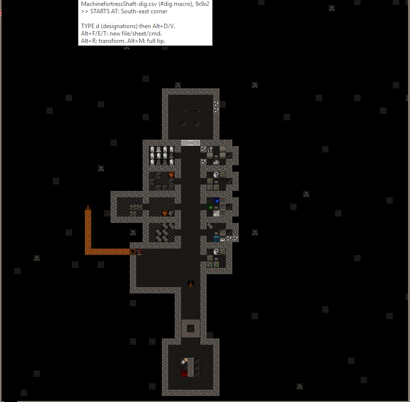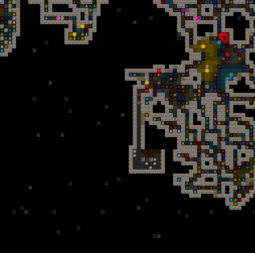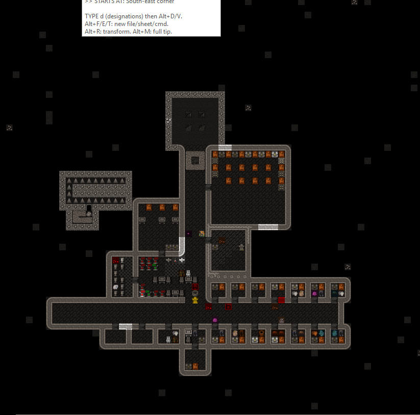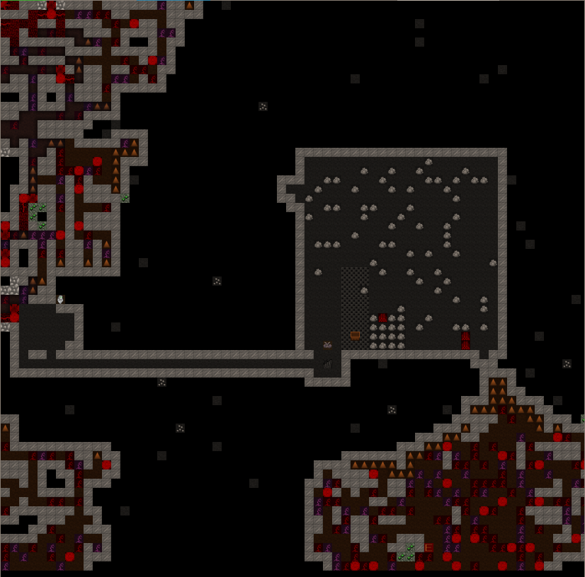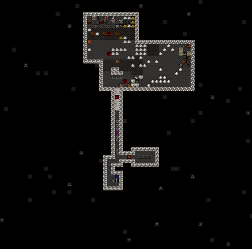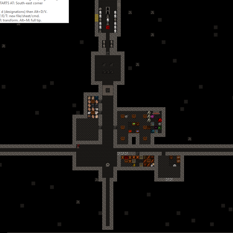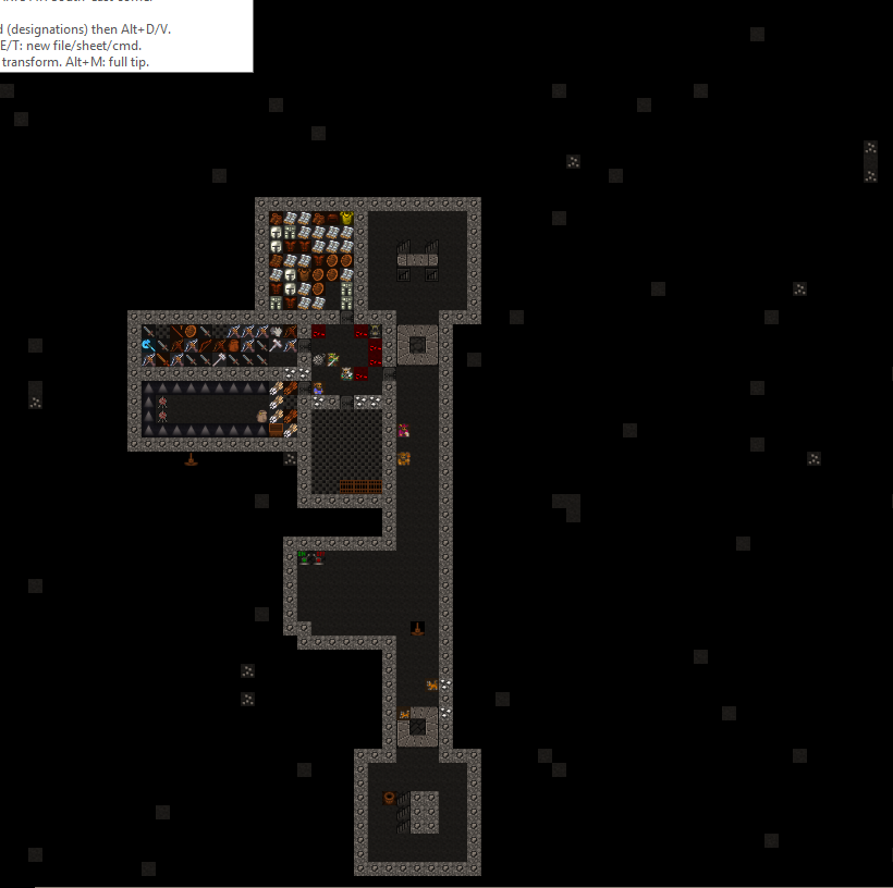 Level 1 is located within the red sand plateau. It is accesed from the surface via a three wide ramp leading down from the citidel. The pervious walled up entrance tunnel can be seen to the left of the Trade Depot. Some of the red sand exterior walls have been replaced with stone for security. After passing down a tunnel a visitor will encounter a battery of cage and stone traps. Beyond that is a retracting bridge over a pit of spkies. The bridge is surrounded by fortifications archers can fire through and just past the retracting bridge is the main gate to seal the fortress. Both the gate and bridge are tied to a single pressure plate and active at the same time. The hall beyond is used to stage military squads in the vent of an incursion. The trade goods stockpile sits off the hallway. This has been full of mugs for nealry 15 years now. A three wide stair leads downward into the fort. At one point the hallway south was walled off, this has been opened up again. The main portion of level 1 was initially dedicated to crops and turkeys. Both have since been relocated to level 2 because of repeated tree root incursions. The level's meeting hall has two levers, one for the rear gate and one previously for the gate now occupied by the walls seperating the level from the entrance area. In the rear is a three wide stair down.