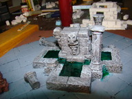 Ive also finished building and priming the ruined tower. Added the water to the Fountain and one of the slums. I mixed some green food coloring in with the woodland scenics water material for a good mordheim sick green color water. A little leaked on the fountain, Ill clean it up tonight and finish some touch up paint, weeds and permanently fix the fallen statue.
