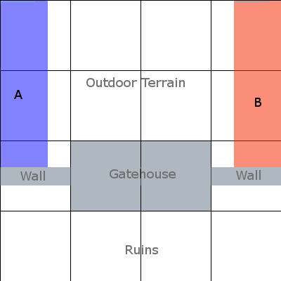 A wall wide enough for a model to stand on it, but not more than 2" should run across the board apr 18" from one edge. Centered on the wall should be a gatehouse with a passage at least 5" wide through it. The gatehouse should have a roof that is large enough for several warriors to occupy it. At least one stair/ladder should lead to the top of the gatehouse on the interior (side closet to the map edge) side. The wall does does not need to be contiguous or solid andcan be in a ruined state. It highest points should be either 1/2 the height of the gatehouse or whatever looks natrual. Players take turns placing ruins on the interior side, no closer than 3" to the gatehouse but they may place them up against the wall. No ruins should be taller than the roof of the gatehouse. Players then take turns placing outdoor terrain (hills, trees, etc). on the exterior side.
