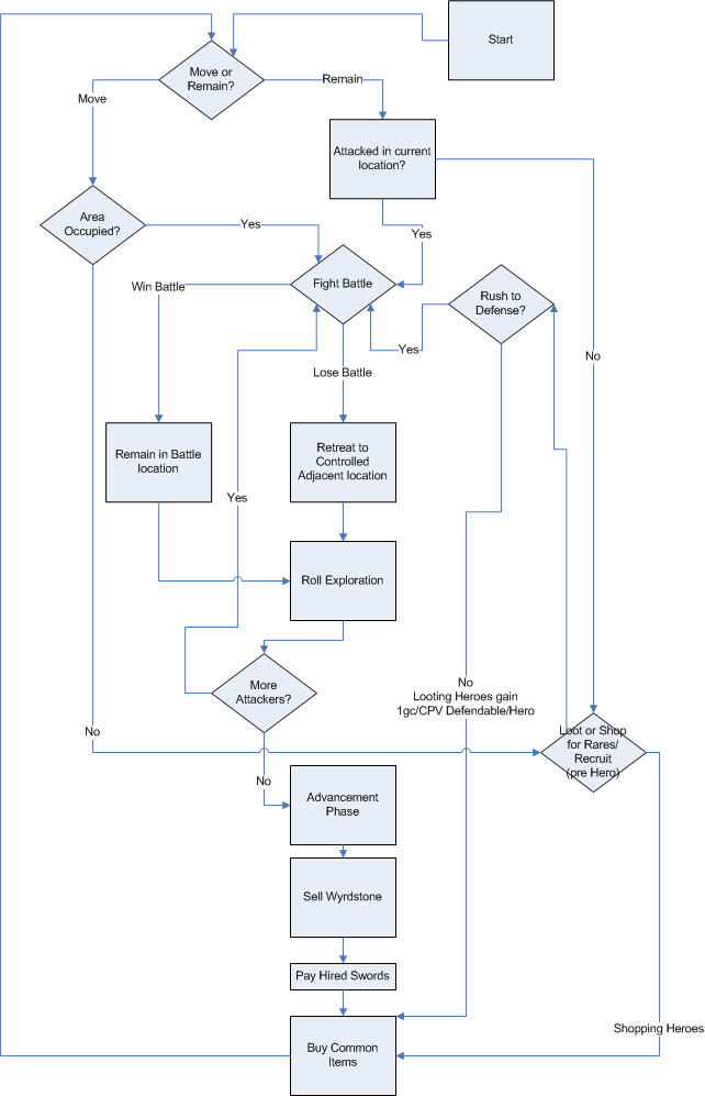 In order to purchase rare items or recruit new warband members heroes must be sent to one of the 4 settlements outside of Mordheim during the looting or Exploration phases. The heroes must be able to trace a unobstructed path though Controlled or allied locations and known connections (shown on the players map) to the target settlement. The heroes sent will be unavailable in any "Rush to Defense" combats that turn. They will always return to the warband even if the path is cut off by other bands movement.