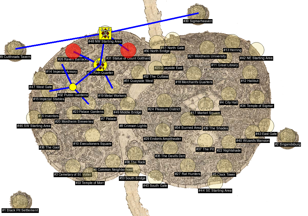 Warbands will arrive in Mordheim via one of the 4 settlements. Each player should inform the GM which settlement they start at (or if listed above at which interior location). The warband does not Control this location. Do not start more than 4 warbands in any settlement.